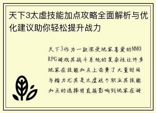 天下3太虚技能加点攻略全面解析与优化建议助你轻松提升战力